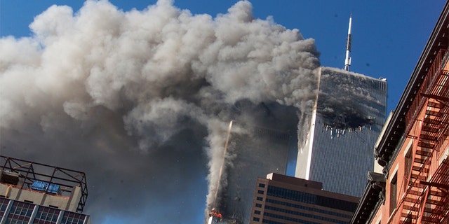 Smoke rises from the burning twin towers of the World Trade Center after hijacked planes crashed into the towers in New York City on Sept. 11, 2001. (AP)
